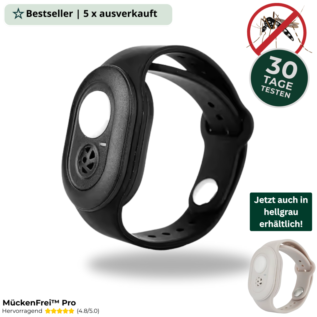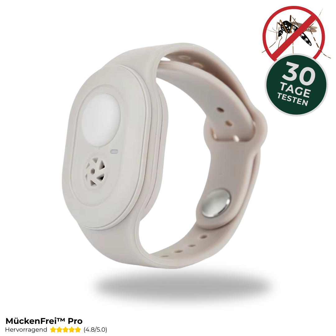 MückenFrei™ Pro schützt dich ganz ohne Chemie, Spray oder Nachfüllen. Mit Ultraschall und gelbem Licht werden Mücken zuverlässig ferngehalten – tragbar wie eine Uhr, völlig unkompliziert, nachhaltig & umweltschonend.