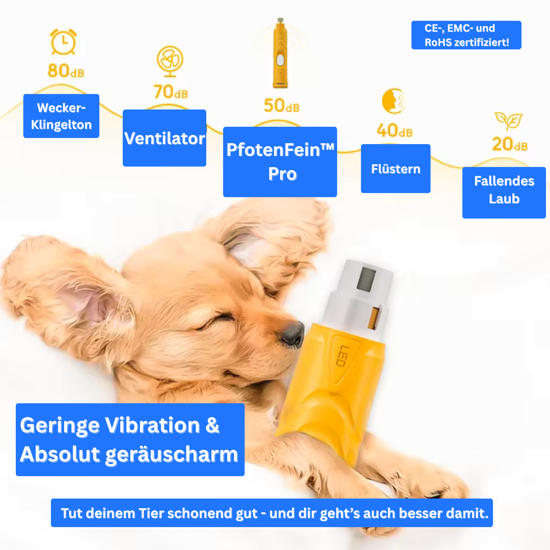 Hinweis: Der PfotenFein™ Pro ist ein Tierpflegegerät und kein medizinisches Instrument. Er dient ausschließlich zur sanften Krallenpflege bei Haustieren. Benutzung auf eigene Gefahr.